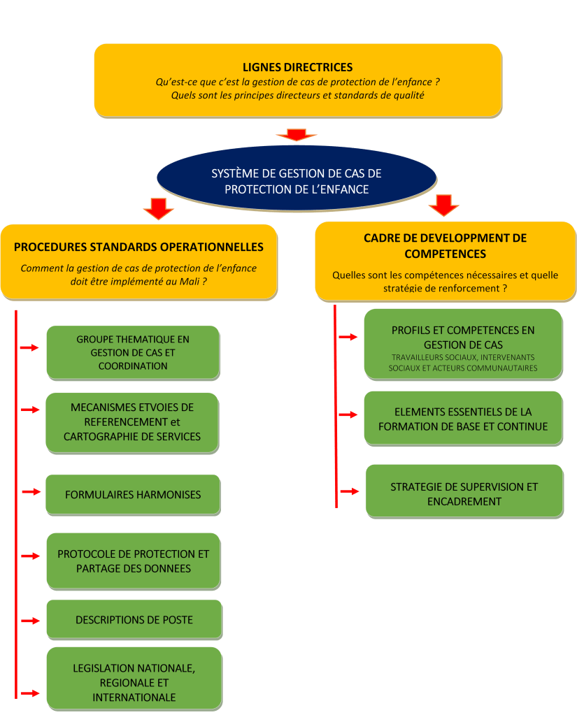 L’opérationnalisation des interventions en gestion de cas repose sur un système de gestion de cas. L’ensemble des éléments ci-dessous constitue les composantes d’un système de Gestion de cas développé au niveau national.